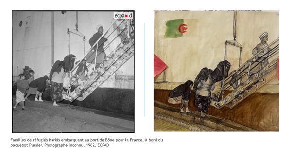 À travers sa passion du dessin, Madame Malgras a choisi d’aborder les différentes formes de mobilité des Harkis, à la fois sur le terrain durant la guerre d’Algérie, mais aussi en France durant leur exil.
