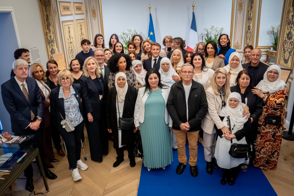 Déjà mises à l’honneur au Palais de l’Élysée lors des Journées européennes du Patrimoine, les licières de la manufacture de Lodève, descendantes de familles de Harkis, ont été invitées à présenter leurs travaux au Président de la République à l’occasion du vernissage. Lors de ce moment d’échange et de partage, les licières et les organisatrices de l’association Mémoires Méditerranées, à l’origine de cette exposition qui leur rend hommage, ont notamment lu des textes produits lors d’un atelier d’écriture mené par Sarah Fourage, autrice et comédienne.